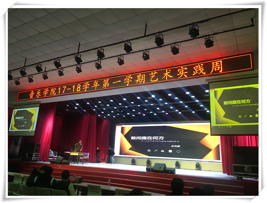 由公司艺术实践教研室组织实施的1718学年第一学期“太阳成tyc7111cc官网艺术实践周活动”按照教学计划在第十四个教学周如期举行,公司1516级音乐学专业200余名本科生参加了此次活动,本次实践周得的主题是“拓展”。在实践周期间,公司副经理王风雷副教授、刘夏宁老师、李志勇老师分别举办了《敢问路在何方——关于音乐专业毕业生就业问题的思考》、《从苹果中学设计——APPLE的设计课堂解读》、《多的是你不知道的事——关于音乐剧》三场专题讲座,三位老师通过翔实的数据、典型的例子、深刻的分析和恰当的代入,从职业生涯规划、艺术学习与创作理念和音乐剧知识普及三个方面,为同学们带来了很多前所未闻的新观念,讲座现场气氛活跃,互动热烈,取得了良好的效果。