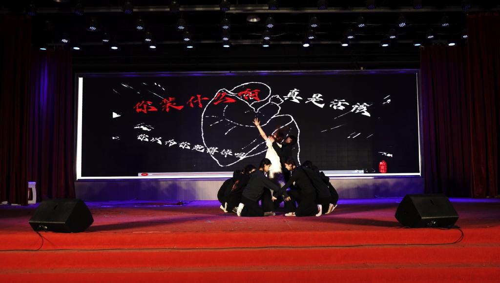 晚会由舞蹈《无畏有界》拉开序幕,舞者用利落的动作冲破虚拟的“边界线”,每一次腾跃都在诠释:青春本就该打破框架,敢以赤子之勇逐光而行;群舞《筑梦》以错落有致的舞步勾勒理想画卷,律动间尽展青年蓄力前行的蓬勃姿态。情景舞蹈《小小的我》以职场实习生视角切入,通过"憧憬-迷茫-破局"的剧情线,细腻演绎当代青年直面挑战的成长轨迹;舞蹈《以青春的名义》回溯五四运动,领舞者振臂高呼的铿锵舞步,将百年前的青年担当镌刻于舞台之上。现代舞《黑与白》以强烈的视觉冲突聚焦校园霸凌议题,通过极具张力的肢体表达叩问青春守护的责任;情景剧《"贷"价》以夸张而写实的表演还原校园贷套路,让观众直观认知金融风险的危害。晚会在全体同学演绎的《一起向未来》中圆满落幕,蓬勃的舞姿凝聚着"与安全同行"的青春誓言。