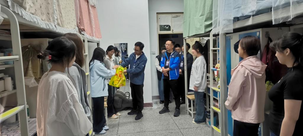 走访过程中慰问组一行与新生们促膝长谈,细致询问他们的生源地,关心入校后生活起居、饮食气候的适应情况,叮嘱同学们遇到困难及时向辅导员或公司反映。针对校园安全,领导和老师重点提醒新生提高防范意识,警惕电信诈骗、虚假兼职等常见风险,对进入宿舍推销的陌生人保持警觉,避免财产损失;同时强调宿舍安全规范,要求严格遵守用电制度,杜绝违规电器,不在宿舍内抽烟饮酒,共同维护整洁、安全的居住环境。
