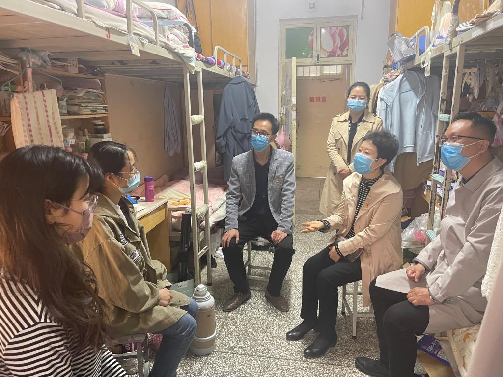 在员工宿舍,高炜和同学们亲切交谈,深入了解同学们的学习生活情况,详细了解毕业生目前的升学和就业情况,并对员工未来的发展规划进行了科学指导。高炜指出,当前疫情形势复杂严峻,同学们要做好个人健康防护,保持安全社交距离,勤洗手、戴口罩、常通风、不扎堆、不聚集,调整好心态,严格遵守校规校纪和疫情防控期间校园封闭管理规定,安全度过这段特殊时期;希望同学们无论是读研深造还是参加工作都要不断加强对新知识的学习,在学思践悟中坚定理想信念,在持续学习中提升核心竞争力,自觉把个人成长成才与祖国发展、民族复兴同频共振,为实现中华民族伟大复兴的中国梦贡献智慧和力量。